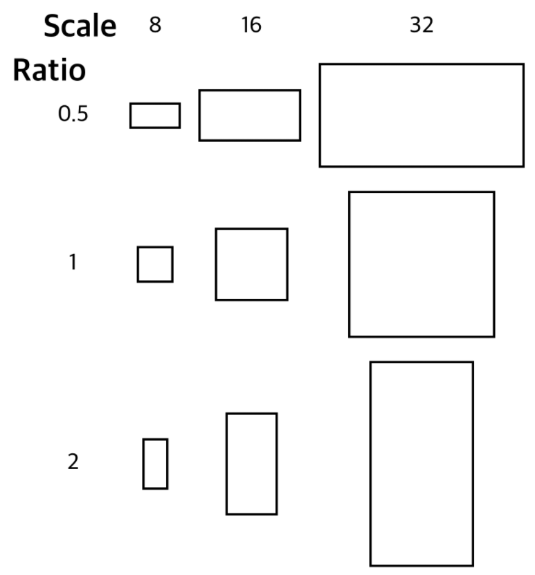 여기서 Anchor box는 3개의 Scale(8, 16, 32)과 3개의 ratio(0.5, 1, 2)를 사용하여 총 9개가 만들어진다. 만들어진 Anchor Box의 모습은 [그림 7]과 같다.