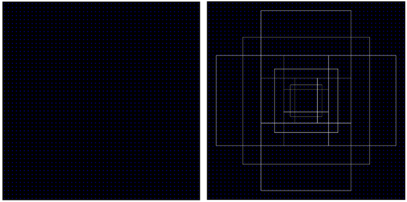[그림 9] (좌) Anchor Box의 중심 좌표들 (우) 중심 pixel이 (400, 400)일 때의 Anchor box 이렇게 만든 22,500개의 Anchor Box를 기준으로 그 안에 물체가 있는지 없는지에 대해 학습을 진행할 것이다.