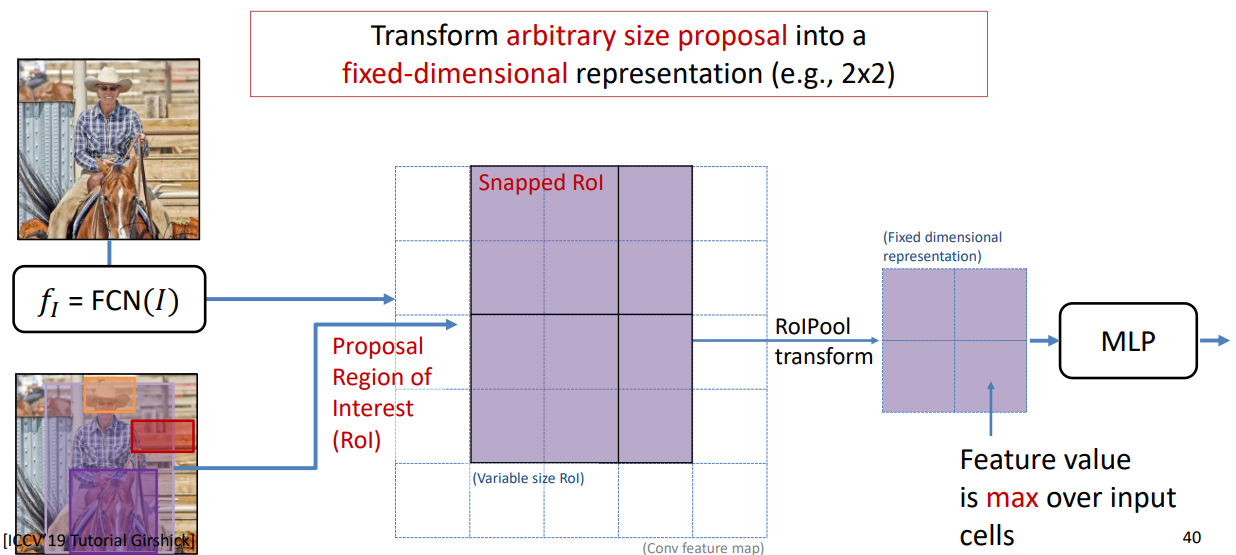 - Projection 된 RoI에 대하여 RoI Pooling 과정을 거치게 한 후, 고정크기의 feature vector를 얻는다. (이 featur vector를 FC Layer에 통과시켜 두 개의 Brunch의 입력이 된다.)