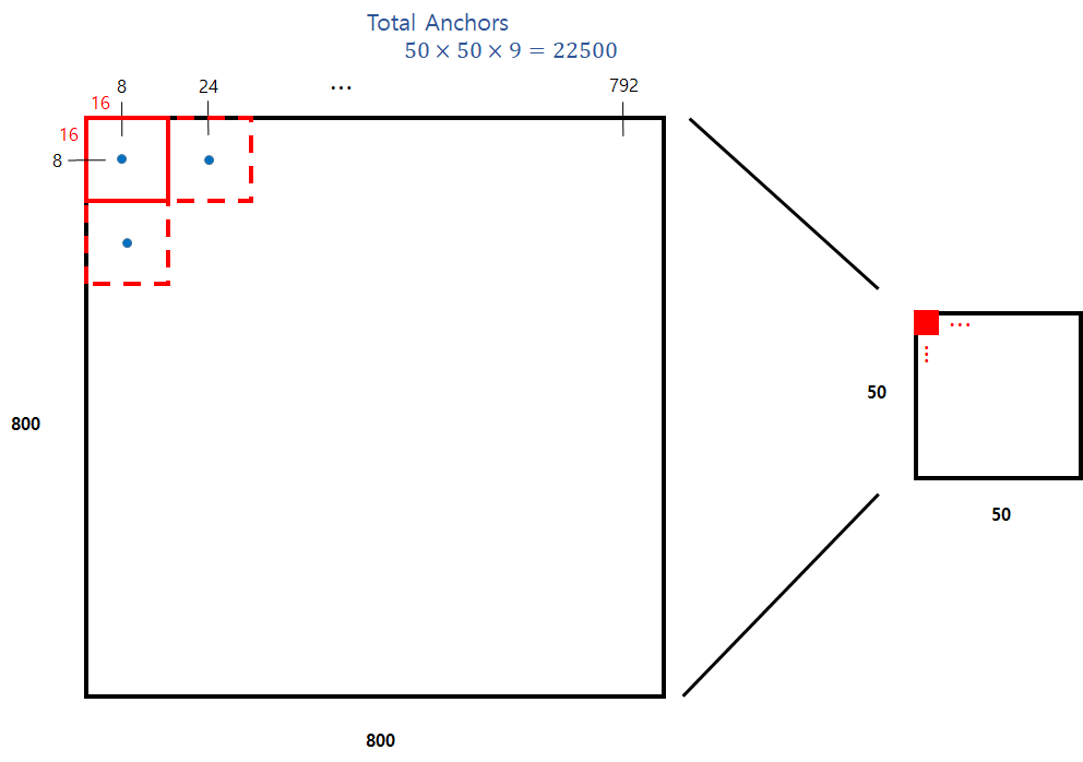 [그림 7] Ratio와 Scale에 따른 Anchor Box 800 $ \times $ 800 Image에서 50 $ \times $ 50 크기의 feature map을 생성했으므로 subsampling ratio=16으로 둔다. (800/50) [그림 8]과 같이 sliding window 방식으로 16 $ \times $ 16 안의 중심 픽셀 (파란색 점)을 중심으로 Anchor Box를 9개를 쳐서 50 $ \times $ 50 $ \times $ 0=22,500개의 Anchor Box를 미리 만든다.