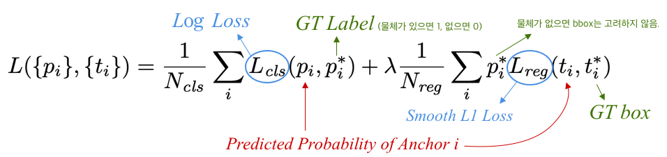 [수식 1] Loss Function for RPN [수식 1]에서 $ L_{cls} $ : Classification은 Log Loss를 사용,