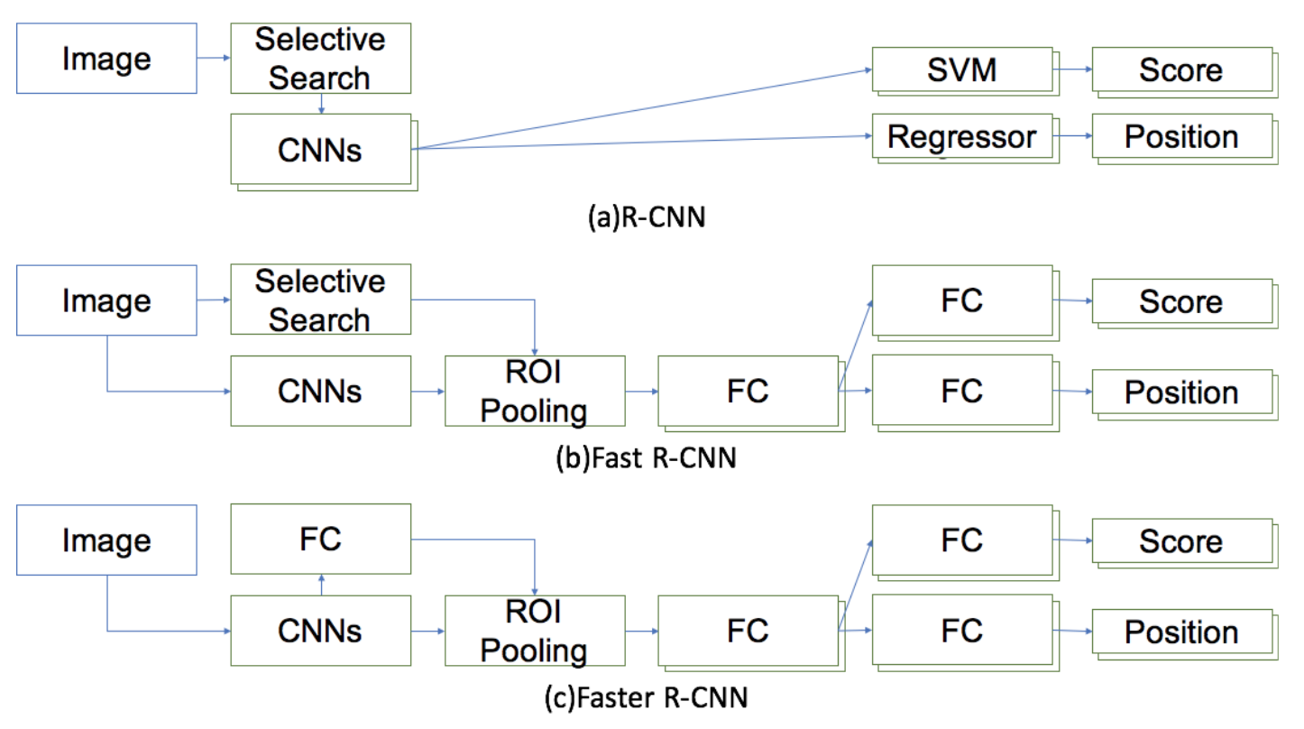 [그림 11]은 R-CNN, Fast R-CNN, Faster R-CNN의 pipline을 그림으로 나타낸 것이다.