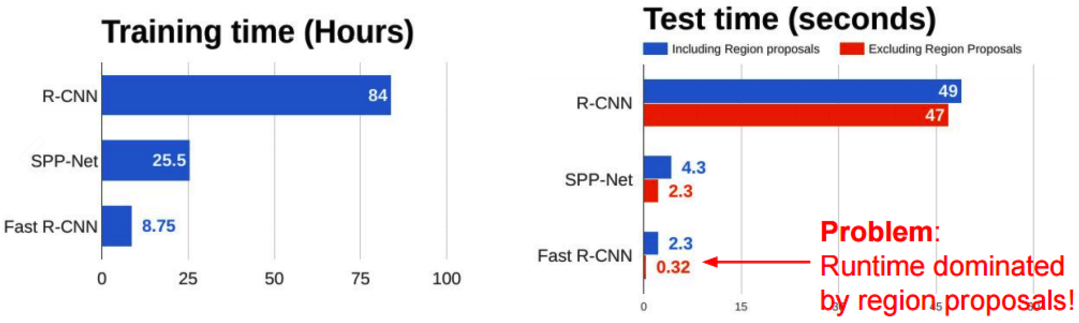 [그림 4] R-CNN, SPP-Net, Fast R-CNN의 Training time 및 Test time 비교 - [그림 4]를 보면, Fast R-CNN은 다른 OD Model들 보다 Training time 과 Test time의 시간을 현저하게 단축 시켰다. 하지만, Test time에서 Region Proposal을 수행할 때 걸리는 시간은 다른 모델들과 비슷하게 2초 정도를 차지하는 것을 확인할 수 있다. Selective Search 알고리즘은 CPU를 사용하기 때문에 이런 문제점이 발생했다. Faster R-CNN은 이 문제점을 해결했다.