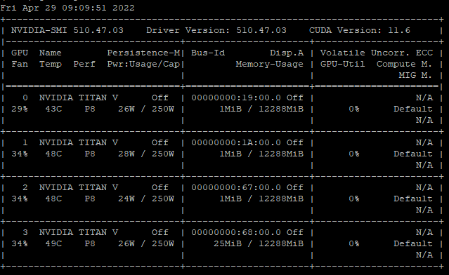 다음 그림은 위의 코드를 실행하여 필자의 서버를 기준으로 TiTAN V GPU가 4장이 있는 것을 확인할 수 있다.