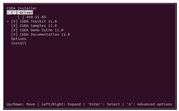 (3) Driver 칸에 Enter를 쳐서 X표시를 해제하고 (위에서 이미 설치함), Install Enter를 입력한다.