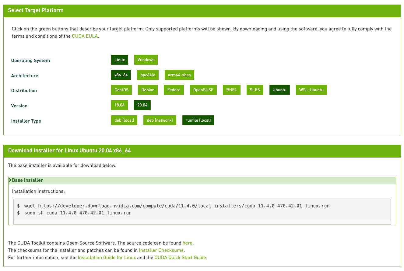 필자는 Ubuntu 20.04, cuda 11.4와 호환되는 CUDA Toolkit을 설치하였다.