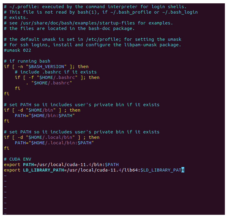sudo sh -c "echo 'export PATH=$PATH:/usr/local/cuda-11.4/bin' >> /etc/profile" sudo sh -c "echo 'export LD_LIBRARY_PATH=$LD_LIBRARY_PATH:/usr/local/cuda-11.4/lib64' >> /etc/profile" sudo sh -c "echo 'export CUDADIR=/usr/local/cuda-11.4' >> /etc/profile" source /etc/profile(7) 설치 확인
