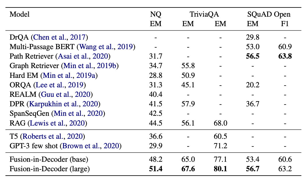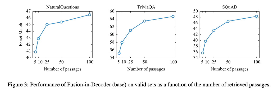 NQ와 TriviaQA benchmark datasets 에서 SoTA를 달성했으며, 흥미롭게도 검색된 구절의 수를 증가시킬 때, 이 방법의 성능이 크게 향상된다는 것을 관찰했다. 이 점은 S2S 모델이 여러 구절에서 증거를 효율적으로 집계하고 결합할 수 있는 유연한 framework를 제공한다는 증거이다.