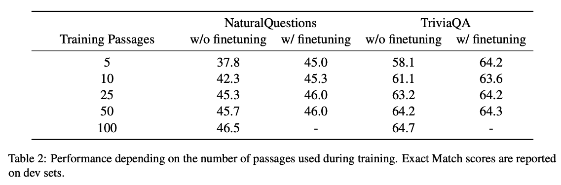 Retrieved passages의 수가 증가할 수록 성능이 높아지며, 학습과 평가에서는 같은 수의 retrieved passages를 사용했다.