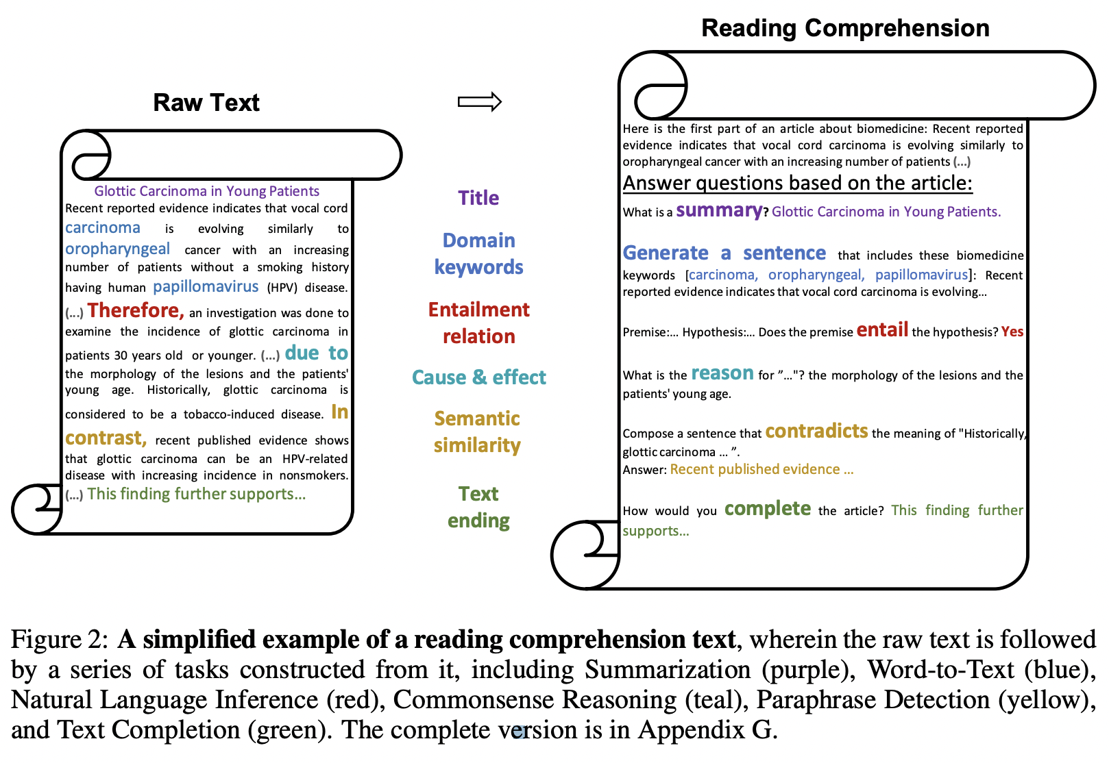 - large-scale raw corpora를 자동으로 reading comprehension texts로 변환하여 domain knowledge를 효과적으로 학습하는 동시에 Prompting 성능을 유지하는 간단한 recipe를 제공한다.