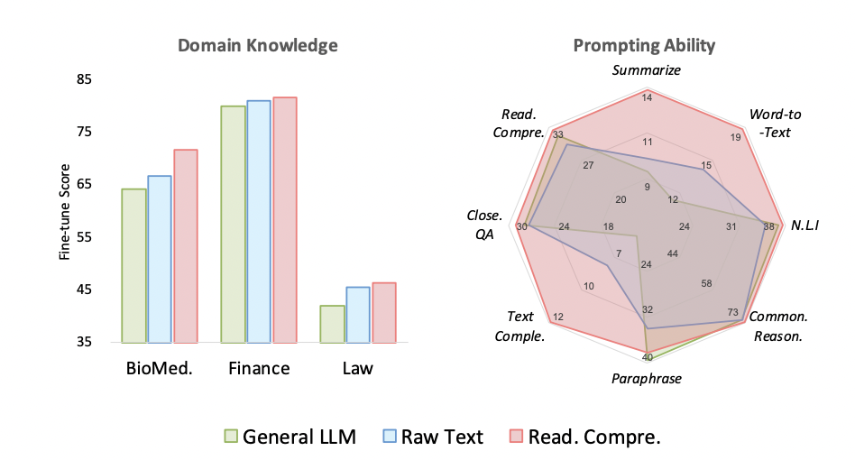 [yongggg's] Adapting Large Language Models via Reading Comprehension ReviewMachine & Deep Learning 2024. 1. 9. 13:28Abstractdomain-specific corpora(corpus)에 대한 지속적인 사전 훈련이 large language models에 어떻게 영향을 미치는지 탐구하여 raw corpora에 대한 training이 domain knowledge를 가진 모델을 만들 수 있지만, 질문에 대한 answering을 유도하는 능력을 크게 손상시킨다는 것을 밝혔다. reading comprehension(독해; 읽기 후의 답변하는 것을 통해 학습한 지식을 바탕으로 질문에 답변할 수 있는 능력이 향상됨)을 통한 human learning에 영감을 받아 raw corpora를 reading comprehension texts로 변환하는 간단한 방법을 제안한다. 각 raw text는 내용과 관련된 tasks의 series로 그 양이 방대하다. 확장성이 뛰어나며 모든 corpora를 pre-training에 적용할 수 있는 본 연구의 방법론은 생물 의학, 재무 및 법률의 다른 세 가지 영역에서 다양한 tasks에 걸쳐 지속적으로 성능을 향상시킨다. 특히 본 연구의 7B language model은 BloombergGPT-50B와 같이 훨씬 더 큰 scale의 domain-specific models와도 경쟁력 있는 performance를 보여준다. 또한 domain-specific reading comprehension texts가 일반 benchmarks에서도 모델의 성능을 향상시켜 더 많은 Domain에서 일반 모델을 개발할 수 있음을 보여준다.  위의 그림은 biomedicine, 금융, 법률 분아야의 domain-specific task에 대한 performance이다. General LLM은 continued training 없는 일반 모델이며, DAPT는 domain-specific raw data에 대해 gneral model을 continual training을 했고 Adapt LLM은 raw corpora를 기반으로 구성된 reading comprehension texts에 대해 일반적인 instrutions과 혼합하여 일반 모델을 지속적으로 교육한다. IntroductionGeneral LLM이 확산되며, Domain-specific LLM이 등장했다. 기존 방법은 크게 세 가지 접근 방식으로 분류할 수 있다. - domain-specific 및 gneral corpora의 혼합 데이터를 처음부터 모델화한다. 이는 직관적으로 domain-specific LLM을 생성하지만 많은 연산량과 데이터의 요구사항으로 인한 문제가 발생한다.