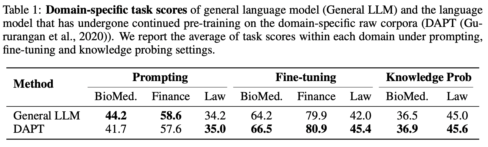 - 본 연구는 LLM에 대한 continued pre-training을 조사하며, domain-specific raw corpora에 대한 continued training은 모델에 domain knowledge를 제공할 수 있지만 prompting 능력을 손상시킬 수 있음을 발견했다.