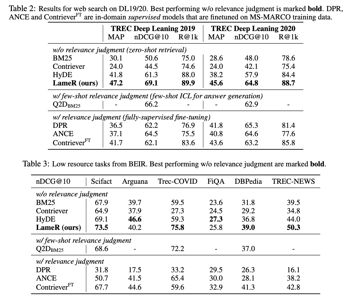 LLM으로 zero-shot scenarios에서 Retrieval 할 수 있는 단순히 LLM과 Retrieval의 단순한 조합을 깨고 zero-shot retrieval의 성능을 높인 Language language model as Retriever (LameR)을 제안한다. 본질적으로, query와 query의 in-domain candidates 구성으로 LLMs에 Prompting함으로써 query와 그것의 잠재적인 답변을 augment할 것을 제안한다. candidates는 정답 여부와 관계없이 대상 collection에 대한 vanilla retrieval procedure를 통해 얻을 수 있다. prompts의 일부로 패턴의 모방 혹은 candidate summarization을 통해 LLM이 보다 정확한 답변을 생성하는 데 도움이 될 가능성이 높다. 모든 candidates가 틀리더라도 그 prompts는 적어도 LLM이 in-collection 패턴과 장르를 인식하도록 만든다. 또한 self-supervised retriever의 성능이 낮기 때문에 LLM-based query augmentation은 retriever와 전체 pipeline의 병목현상을 일으키는 등 비효율성을 가진다. 따라서 본 연구에서는 non-parametric lexicon-based method(e.g., BM25)를 활용하여 query document가 글자대로 중첩되도록 하는 것을 제안한다. 이와 같이 LameR은 LLM으로의 retrieval procedure를 투명하게 하여 병목 현상을 방지한다.