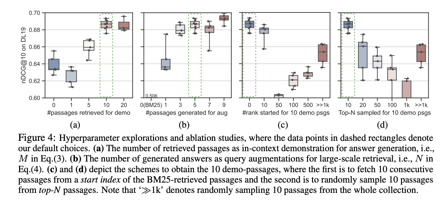 in-domain corpora의 무지 때문에, LLM은 짧고 의도가 모호한 query에 대해 domain 밖의 answser를 생성하여 query증강을 toxic하게한다. dense retrievers의 모호한 능력 덕분에, 이런 query augmentation은 여전히 seqrch quaility를 높게한다. 그러나 lexicon-based(어휘 기반, say BM25)의 경우 out-of-domain의 augmentations으로 인해 성능 향상이 줄어들 것이다. 정량적으로 아래의 그림 2를보면, 'Contriever'는 SoTa self-supervised dense retriever 인 반면에, BM25는 대표적인 lexicon-based retriever이다. vanilla setting에서는 BM25가 Contriever를 이길 수 있지만, HyDE는 Contriever가 BM25보다 2배 향상된 성능을 제공하여 BM25의 경쟁력을 떨어뜨린다.