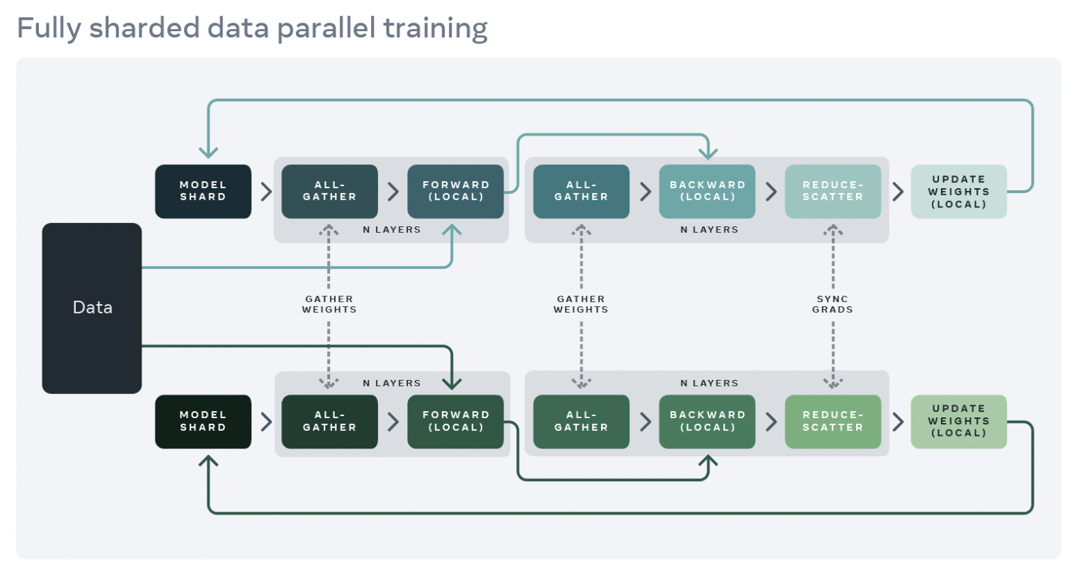 FSDP에서는 오직 모델의 shard만이 GPU 상에 존재한다. 그런 다음, loca에서 forward pass를 계산하기 위해 (all-gather step에 의해) 다른 GPU들로 부터 모든 가중치가 수집된다. 이러한 가중치의 수집은 이후 backward pass 전에 다시 수행된다. backward pass 이후에 Local gradients는 reduce-scatter 단계에 의해서 평균되고 GPU들에 걸쳐 sharding되며, 이는 각각의 GPU가 그것의 local weight shard를 업데이트할 수 있게 한다.