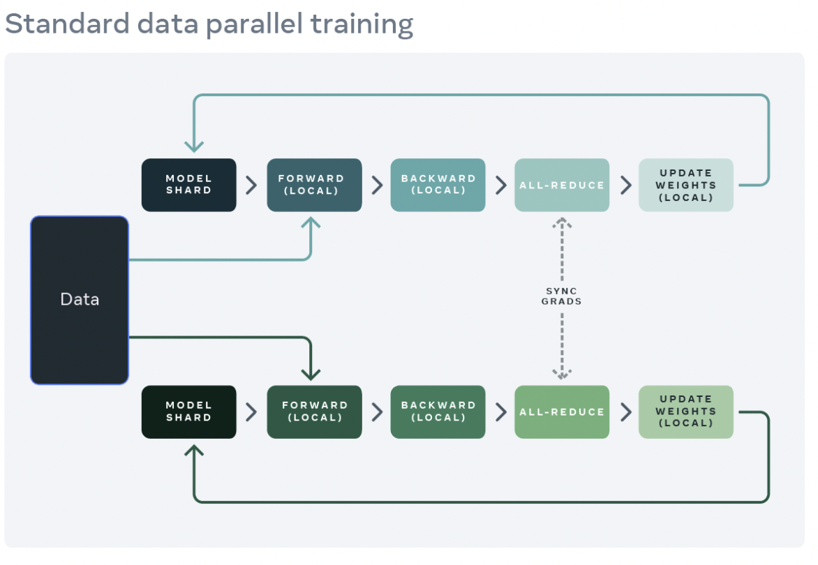 standard data parallel training methods에서 models의 복사본이 각 GPU 상에 존재하고 forward and backward 패스의 시퀀스가 데이터의 shard에 대해서만 평가된다. 이러한 Local computations 후에, global gradients update를 계산하기 위해, 각 Local process에 대한 parameter 및 optimizers가 다른 GPU들과 공유된다.