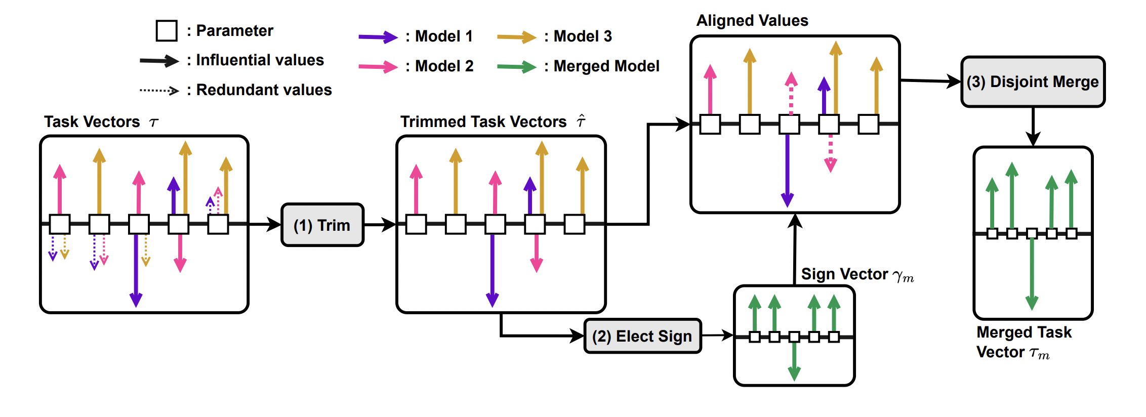 multiple task-specific models $\{ \theta_{t} \}^{n}_{t=1}$을 병합하기 위해서 먼저 그에 상응하는 task vectors $\{ \tau_{t} \}^{n}_{t=1}$을 생성한다. 이 task vectors가 주어졌을 떄, TIES-MERGING method는 병합을 수행하기 위해서 다음의 3개의 steps을 따른다.