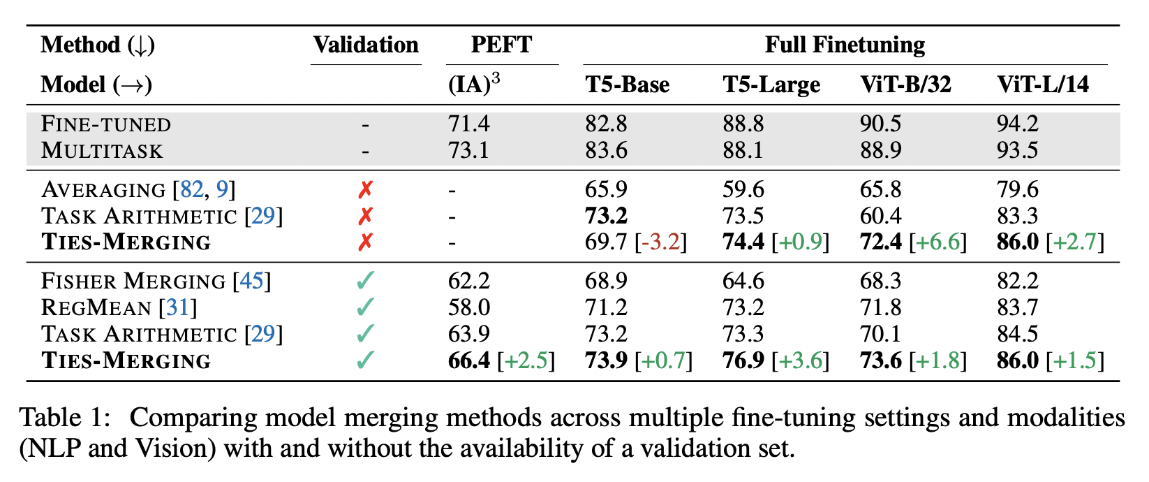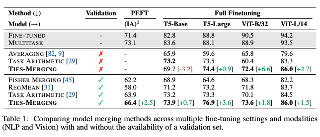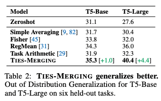trim 이후에도 부호 충돌이 발생하며, models의 수에 따라 증가한다. trimming 후 부호 충돌이 발생하는 params의 빈도와 merge 되는 모형의 수를 plot한 그림이다. 본 연구진은 (1) 언어 및 vision benchmarks를 포함한 다양한 양식 (2) T5-base and T5-large 뿐만아니라 ViT-B/32 and BiT-L/14와 같은 서로 다른 모델 크기의 모델 (3) in-domain 및 out-domain task, (4) full fine-tuning or parameter efficient fine-tuning (5) merging hyperparameters를 설정하기 위한 유효성 검사 세트의 유무에 따라 다양한 설정에서 제안된 TIES-MERGING 방법의 효과를 입증한다. 본 연구진은 TIES-MERGING이 이러한 모든 실험 설정에서 Task Arithmetic, RegMean, Fisher Merging, and 및 weight averaging과 같은 다른 지표에서 다른 방법보다 성능이 뛰어나다는 것을 보여준다. 특히 in-domain evaluation에서 TIES-MERGING은 NLP 및 vision 설정에서 각각 평균 2.3% 및 1.7% 절대값으로 strongest baseline을 능가한다. (아래 표 1.) out of domain generalization(아래 표 2.)의 경우 TIES-MERGING은 T5-base 및 T5-large 모델에서 각각 1.0% 4.4% 절대값으로 strongest baseline을 능가한다.