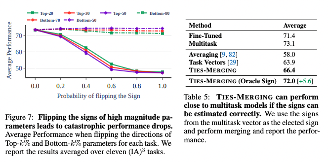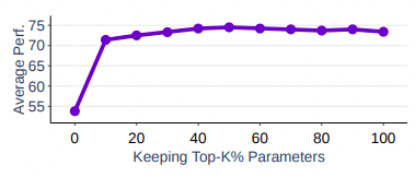 performance는 high-magnitude parameters 중 작은 부분에 의존한다. 각 task-vector에 대해 가장 큰 상위 k%의 parameter만 유지하고 11개 작업에 대한 평균 성능을 표시했다. 매개변수의 상위 20%만 유지를 해도, 성능이 저하되지 않는다. 이는 fine-tuning 중에 도입된 많은 parameter 변경 사항들이 중복됨을 보인다. 따라서 병합 중에 해당 값을 무시하면 작업의 성능을 손상시키지 않으면서 영향력 있는 parameter에 대한 간섭을 방지할 수 있다.