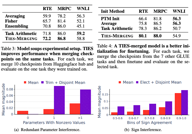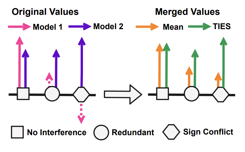 이 논문에서는 이전 merge 기술이 (a) 중복 Parameter 변수 값으로 인한 간섭 (b) model 간에 주어진 매개 변수 값의 부호에 대한 불일치 라는 두가지 주요 간섭 원인으로 인해 부주의하게 귀중한 정보를 잃는 다는 것을 보여줍니다. 이를 해결하기 위해 모델을 병합할 때 세 가지 새로운 단계인 TRIM, ELECT SIGN, MERGEING(TIES-MERGING)을 도입한다. (1) fine-tuning 중에 소량만 변경된 parameter를 재설정하고, (2) 부호 충돌을 해결하며, (3) 최종 합의된 부호와 일치하는 parameter만을 병합합니다.