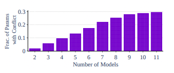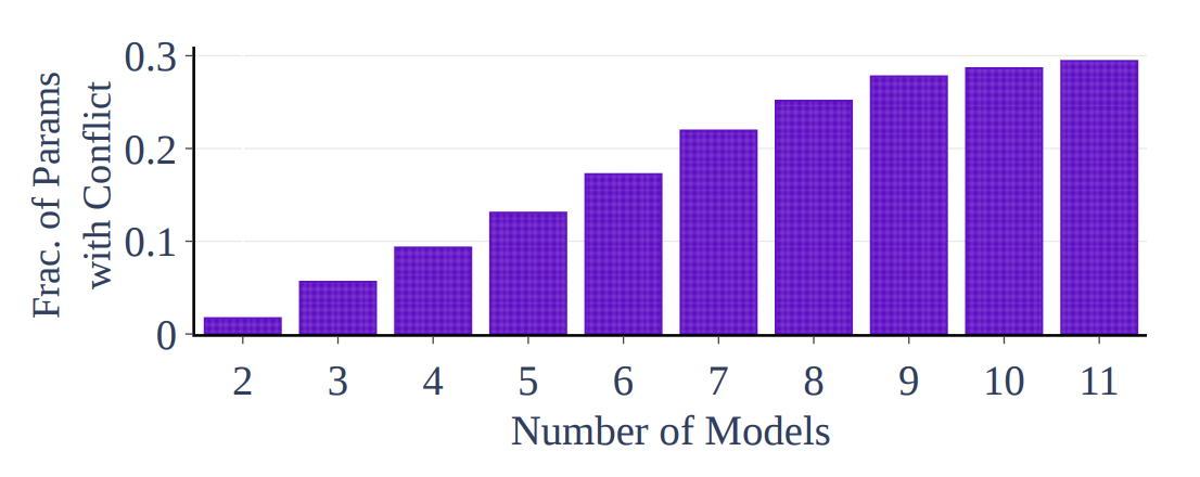 서로 다른 fine-tuned model은 task-vector parameter에 반대되는 changes를 도입하여 충돌하는 부호로 인한 간섭을 유발할 수 있다. (그림 2의 정육각형) 아래 그림은 다양한 수의 모델을 병합할 때, 부호 충돌의 빈도에 대한 분석을 제시한다. 먼저 영향력 있는 parameter의 상위 20%만 유지하여 11개 task에 대한 task-vector를 trimming한다. 그런 다음 병합할 모델 수를 2개에서 11개로 늘릴 때 부호 충돌이 발생하는 parameter의 비율을 표시한다. 특히 서로 다른 task의 2개 모델만 병합하거나 동일한 Task의 여러 모델을 병합할 때도 부호 충돌이 발생하며, 병합되는 모델의 수에 따라 부호 충돌의 가능성이 증가한다.