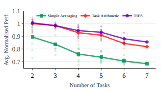 최근 model merging에 초첨을 맞춘 연구가 증가하고 있다. merging의 한 application은 추가 training을 수행하지 않고 multiple task-specific models를 단일 다중 작업 모델로 결합하는 것을 포함한다. 이전 연구에서는 매개변수 중요도를 통합하거나 순열의 불변성을 설명하는 더 정교한수단을 통해, weights 체계가 다른 개별 모델 weights을 단순 평균 합산하여 모델을 병합했다. 이러한 방식으로 fine-tuned model을 결합하는 것은 fine-tuned model의 parameter 값에서 pre-trained model의 parameter 값을 차감하여 계산된 task vector를 합산하는 것으로 볼 수 있다.