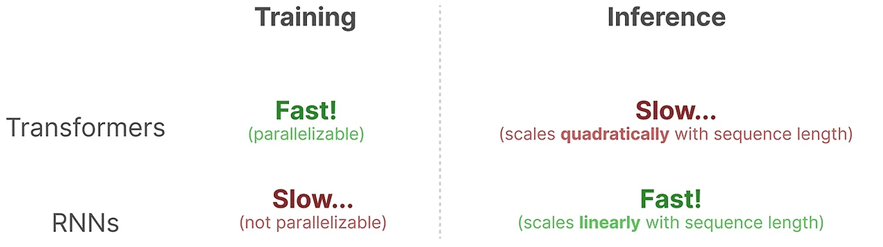 RNN은 이전 step의 정보를 다음 step으로 전달할 수 있는 looping 메커니즘을 갖고 있다. 출력을 생설 할 때, RNN은 이전 step의 hidden state와 현재의 input만 고려해야 한다. 이는 transformer에서 모든 이전 hidden state를 다시 계산하는 것을 방지한다. 즉, RNN은 Sequence 길이와 선형적으로 비례하는 빠른 추론을 할 수 있다. 또한 이론적으로는 무한한 context length를 가진다.