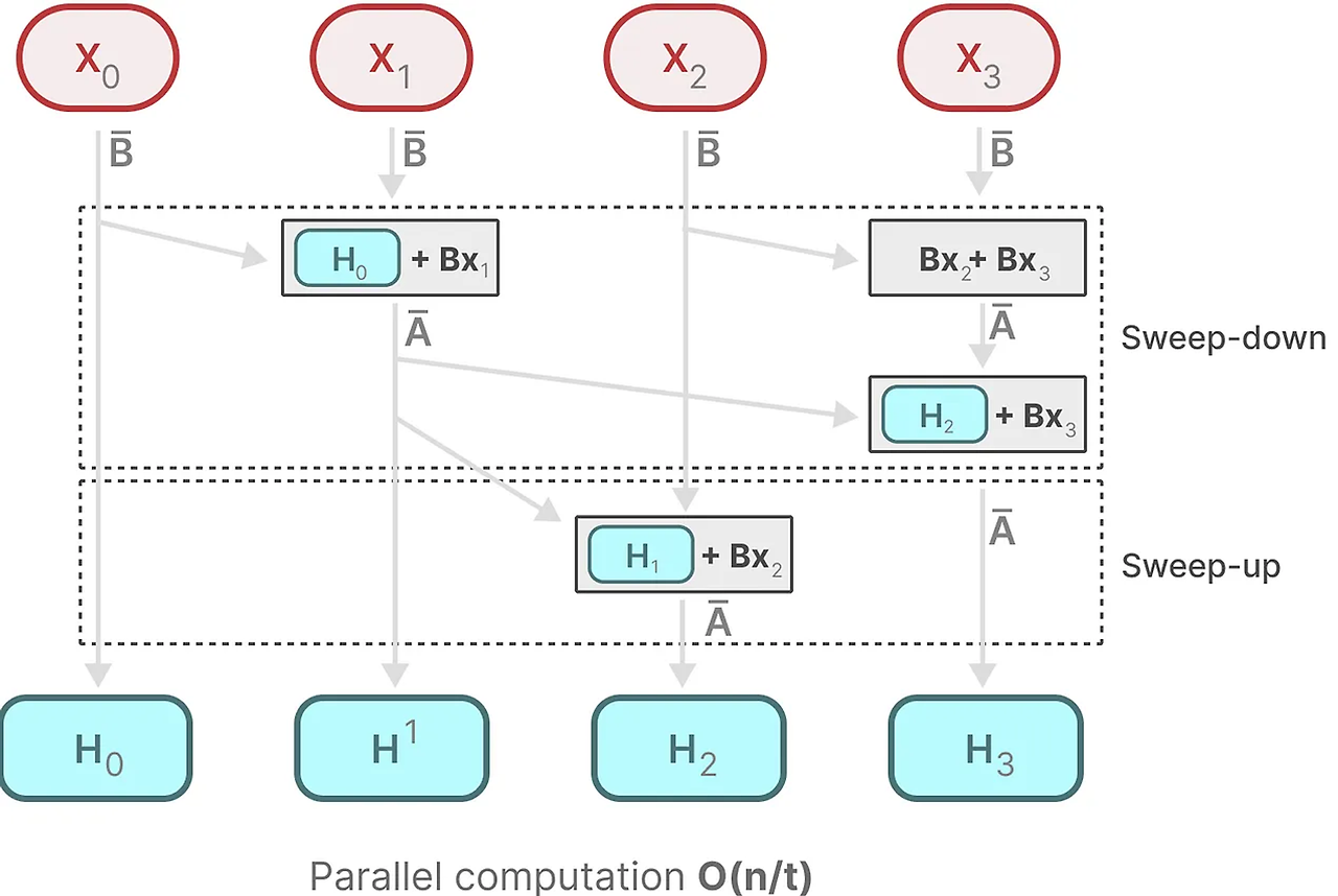 병렬화와는 대조적으로, 이전 state를 가지고 있어야만 각 state를 계산할 수 있으므로 병렬화는 불가능 해보이나, Mamba는 병렬 스캔 알고리즘(https://developer.nvidia.com/gpugems/gpugems3/part-vi-gpu-computing/chapter-39-parallel-prefix-sum-scan-cuda)을 통해 이를 가능토록 한다.