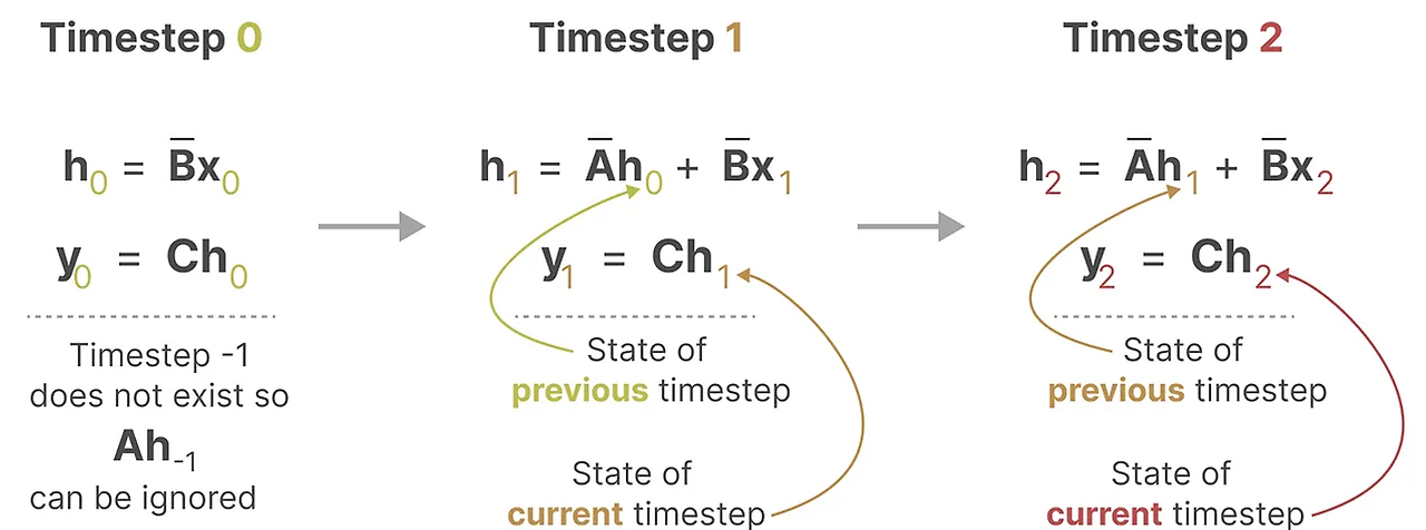 각 시간 단계에서 현재 입력 $Bx^{k}$가 이전 state $Ah_{k-1}$에 어떻게 영향을 미치는지를 계산한 다음, 예측된 출력 $Ch_{k}$를 계산한다.