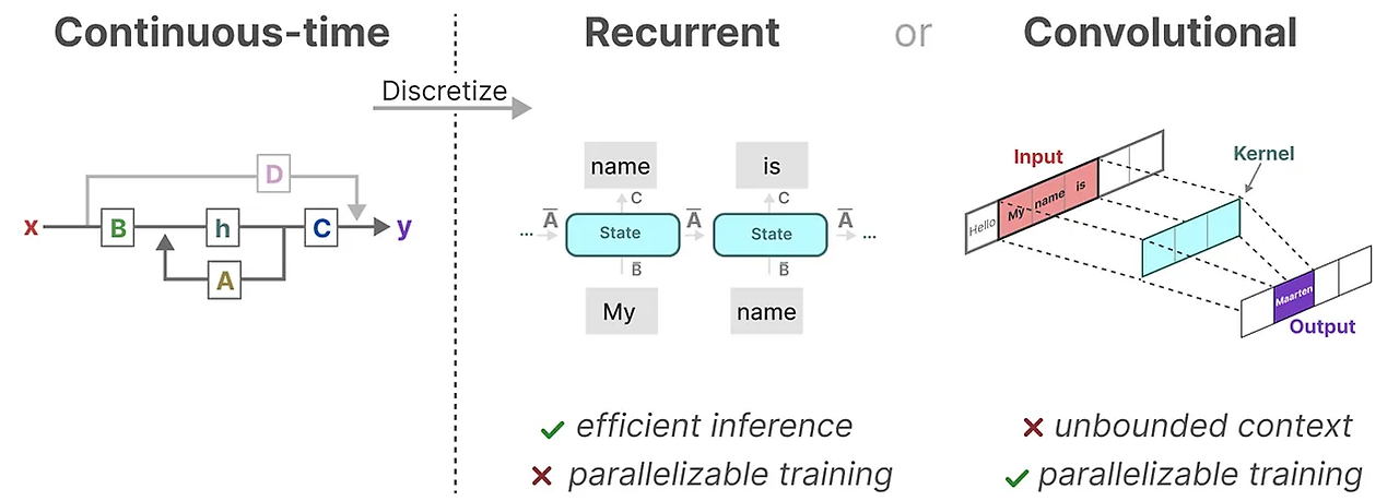 위의 장점을 이용하고자 Recurrent SSM을 통한 효율적인 추론과 Convolutional SSM을 통한 병렬화된 훈련을 할 수 있게 됐다.