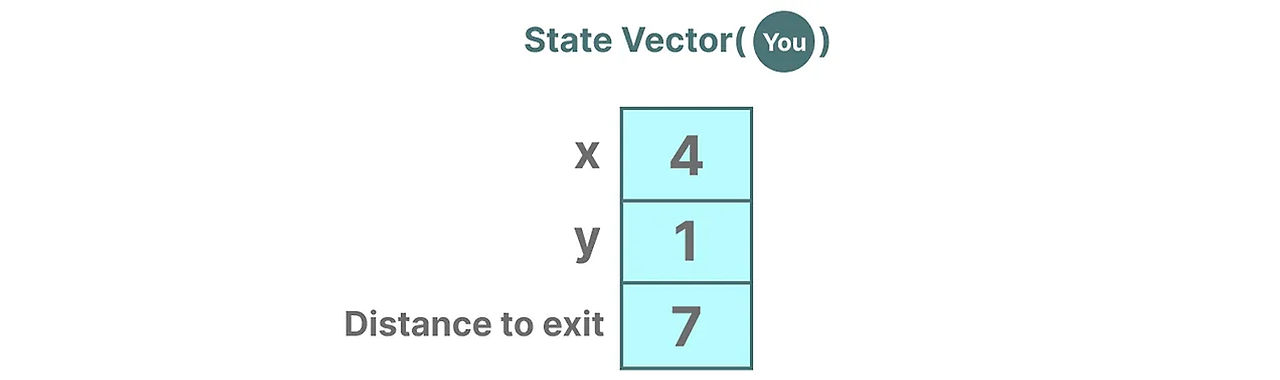 이와 같은 State Vector는 언어 모델에서 Embedding 혹은 hidden state vector도 입력 Sequence의 "State"를 설명하는 데 자주 사용되기 때문이다. 예를 들어, 현재 위치(State) vector는 다음과 같은 형상을 띌 수 있다.