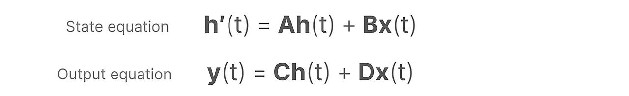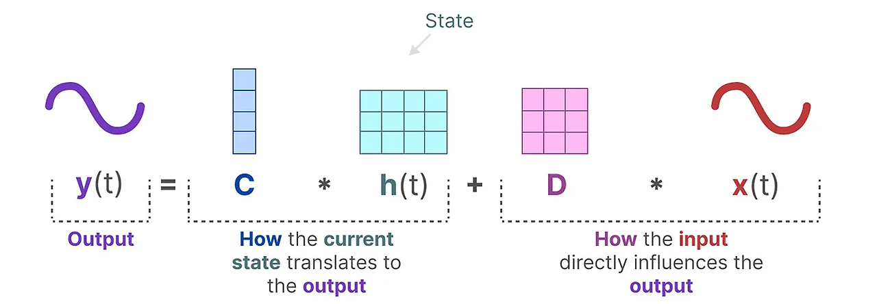 $h(t)$는 주어진 시간 $t$에서의 hidden state representation을 나타내며, $x(t)$는 어떠한 입력을 나타낸다. output 방정식은 state가 어떻게 출력으로 변환되는지 (행렬 C를 통해)와 입력이 출력에 어떻게 영향을 주는지 (행렬 D)를 통해 설명한다.
