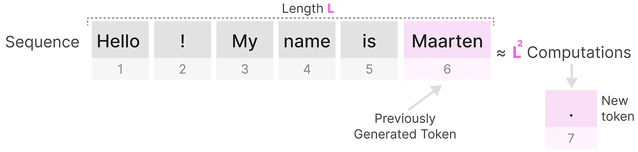 다음 토큰을 생성할 때, 이미 일부 토큰을 생성했더라도 전체 Sequence에 대한 Attention을 다시 계산해야한다.