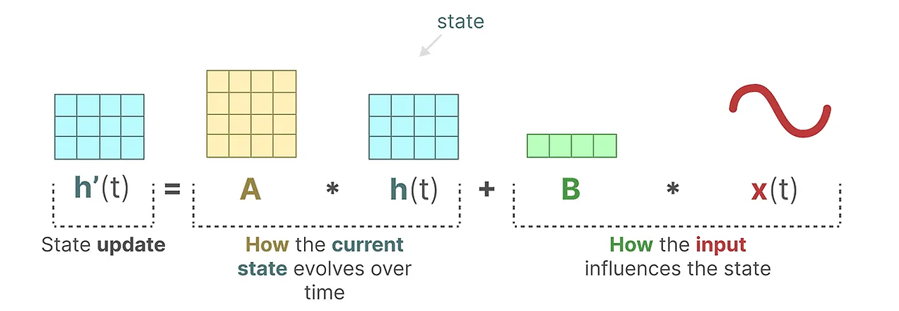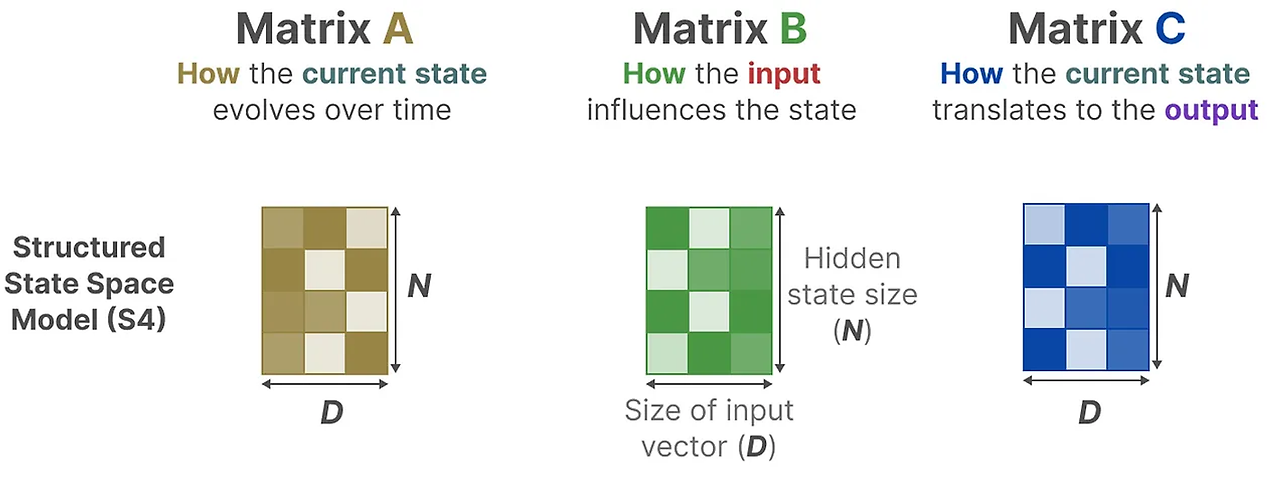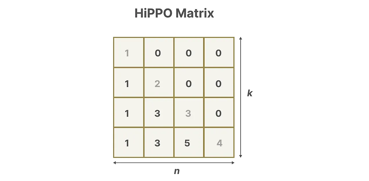 행렬 A는 아마도 SSM 공식의 가장 중요한 측면 중 하나일 것이다. 위의 "재귀" 부분에서 본 것처럼, 이 행렬은 이전 상태에 대한 정보를 포착하여 새로운 상태를 구축한다.