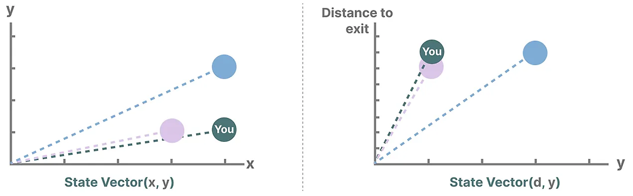 상태를 설명하는 변수들, 예제에서는 X와 Y좌표와 출구까지의 거리는 "State Vector"로 표현될 수 있다.