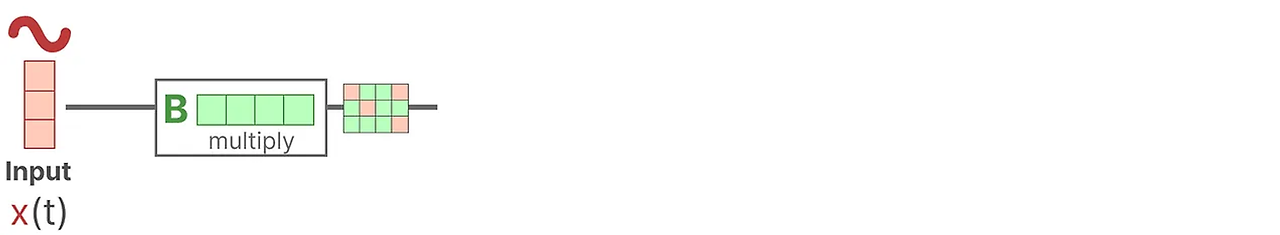어떤 입력 신호 $x(t)$가 있다고 가정하자. 이 신호는 먼저 시스템에 입력이 어떻게 영향을 미치는지 설명하는 행렬 B에 곱해진다.