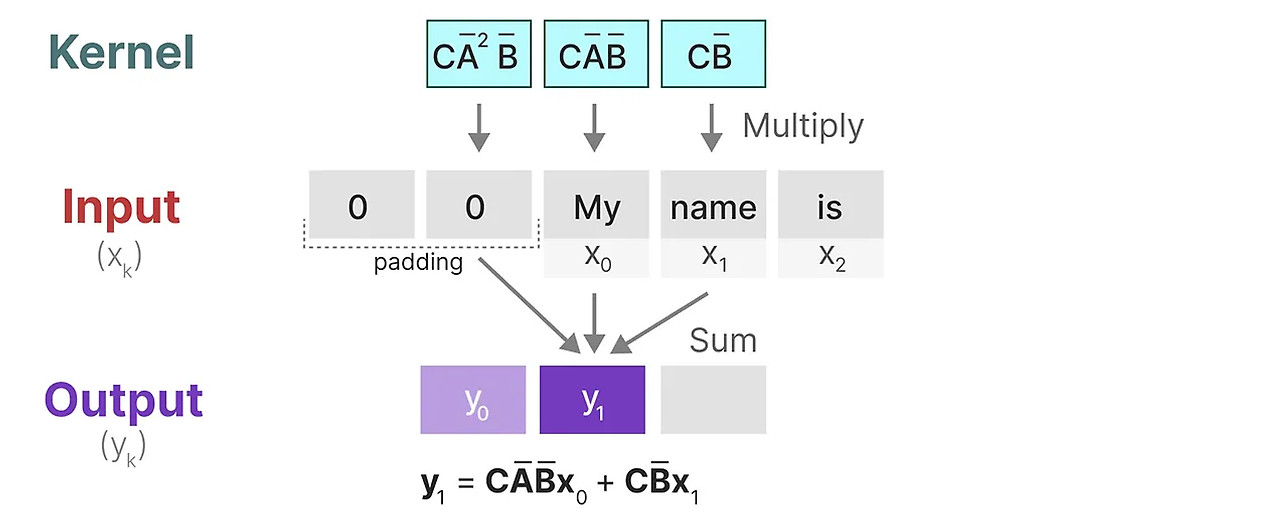 이 Kernel이 실제로 어떻게 작동하는지 보자. Convolution처럼 SS커널을 사용하여 각 token set을 통과하고 출력을 계산할 수 있다.