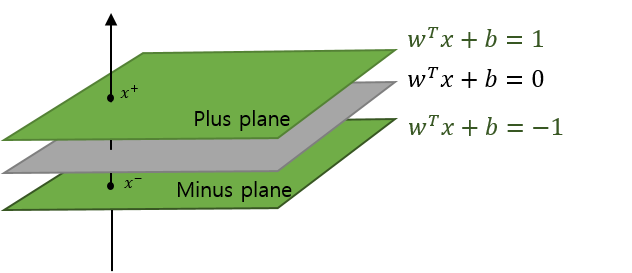 [그림 3] SVM의 분류 경계면 도식화 plus plane과 minus plane은 평행이기 때문에, plus plane위의 벡터 $x^{+}$와 minus plane 위의 $x^{-}$의 관계식은 (수식 1)과 같이 얻어낼 수 있다.
