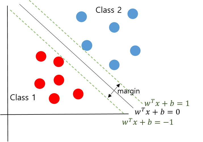 [그림 2]에서 표현된 margin을 최대화하는 초평면을 찾는다.