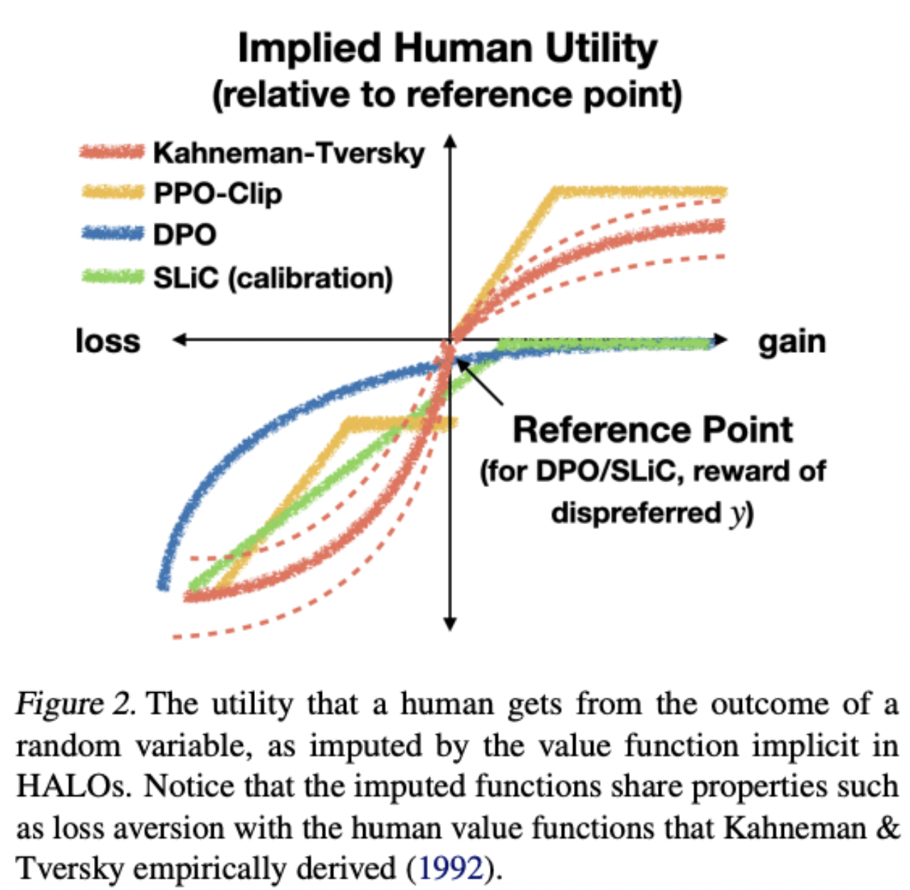 dummy +1/-1 보상을 사용한 PPO의 성공은 적절한 귀납적 편향이 주어지면, 좋음/나쁨을 나타내는 이진 신호만으로도 DPO 수준의 성능에 도달할 수 있음을 나타낸다. 비록 offline PPO 접근 방식 자체는 일정 규모를 넘어서지 못했지만, 이를 고려하면서 보다 원칙적인 접근법으로 우리는 이제 Kahneman-Tversky의 인간 효용 모델을 사용하여 HALO를 도출한다. 이를 통해 선호도의 Log Likelihood를 최대화하는 대신 직접적으로 효용을 최적화할 수 있게 된다.