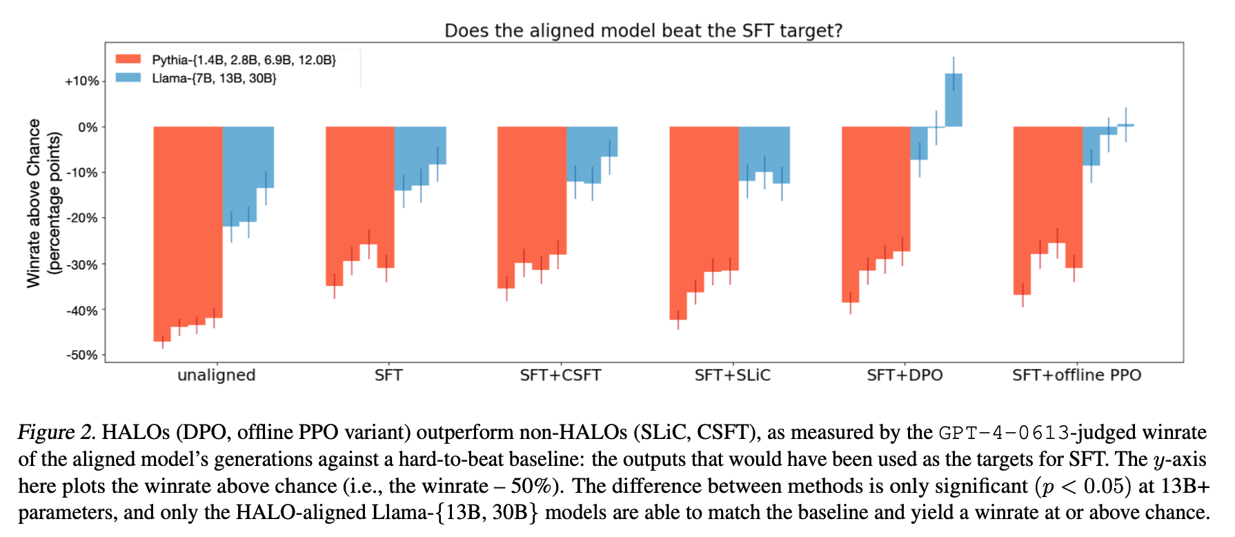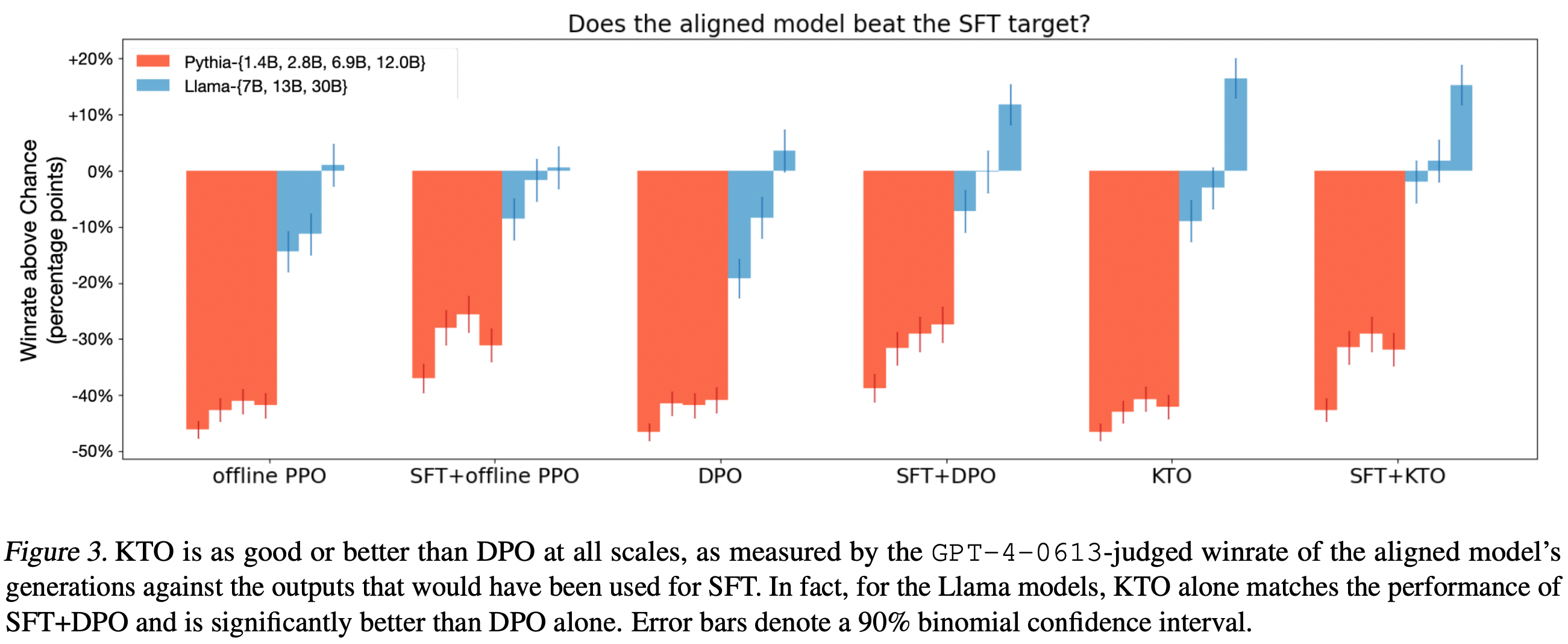 위의 Figure 3에서 볼 수 있듯, SFT+KTO는 SFT+DPO와 경쟁할만한 성과를 보였으며, Llama-{7B, 13B, 30B} 모델에서는 KTO 단독 성능이 DPO 단독 성능 보다 우수했다. pythia 모델에서는 두 방법 간의 유의미한 차이가 없었는데, 이 차이를 보이기 위해선 최소한의 모델 용량이 필요함을 시사한다.
