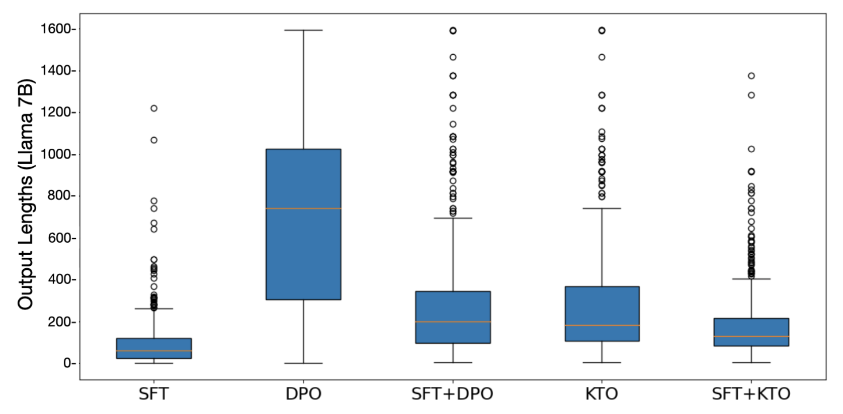 KTO로 align 된 Llama-{13B, 30B} 모델은 SFT+KTO 모델과 비교할 만한 성능을 보였으며, SFT를 먼저 수행하지 않았음에도 불구하고 유사한 성과를 냈다. 본 연구에서 test한 정렬 방법 중에서 이런 결과를 보인 것은 KTO가 유일하다. 이는 KTO만으로도 평균 응답 길이를 대체로 일정하게 유지하는 반면에, SFT 없이 DPO를 실행하면, 응답 길이가 크게 증가할 수 있기 때문이다.