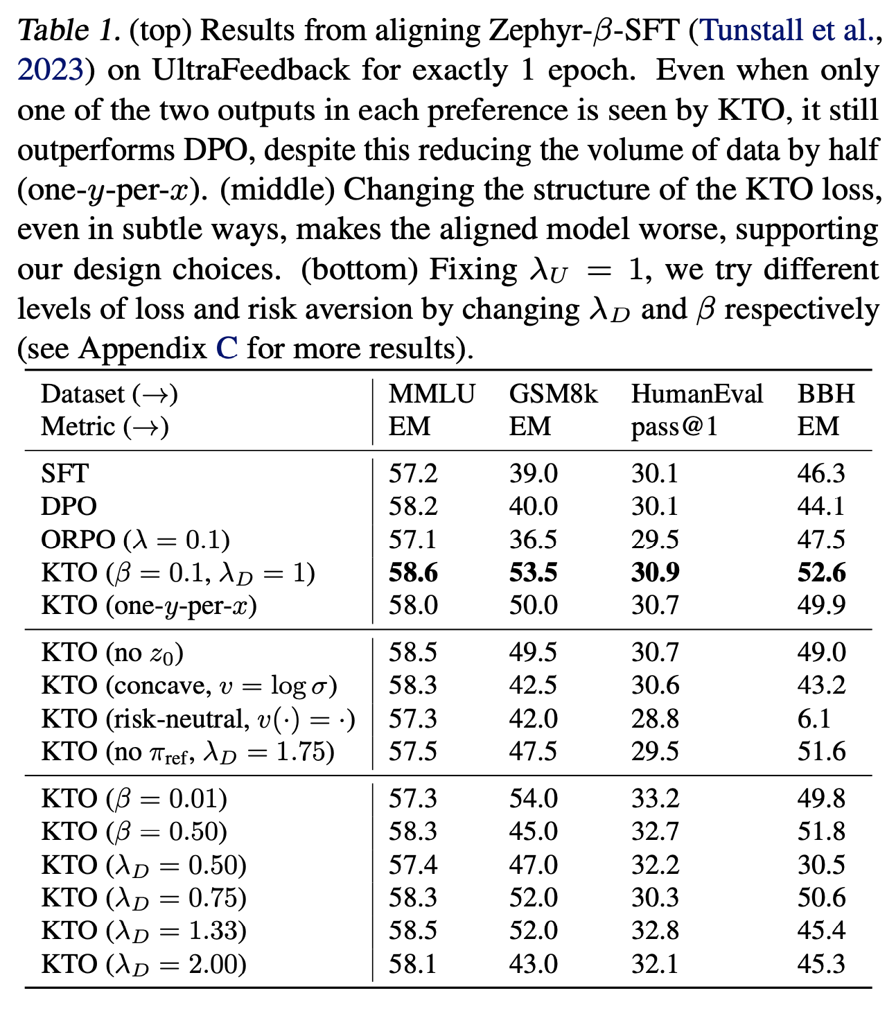 KTO는 입력에 대한 출력이 바람직한지의 여부를 이진 신호로만 학습하여, DPO 등 기존 방법과 동일한 데이터를 사용하면서, 더 나은 성능을 보여준다고 합니다.
