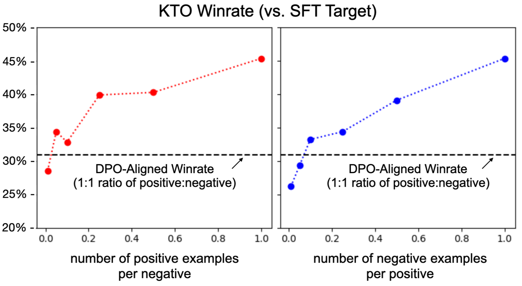 - KTO는 극단적으로 imbalance한 데이터셋으로도 DPO와 비슷한 성능을 보여줄 수 있다. 따라서 선호 dataset이 human alignment에 기인하지 않는다는 것을 시사한다.