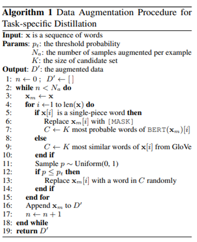 위의 Distillation loss를 사용하여 pre-train model의 General Distillation을 마친 후, pre-train이 끝난 student model과 fine-tuning BERT model을 이용하여 두 번째 단계인 task-specific distillation을 진행한다. 이 때, task-specific에서 traing set의 부족 문제 때문에, data augmentation 방법을 제안하였으며, 그 방법은 간략하게 pre-trained language model BERT와 GloVe 단어 임베딩을 사용하여 word-level replacement를 진행하는 것이다.