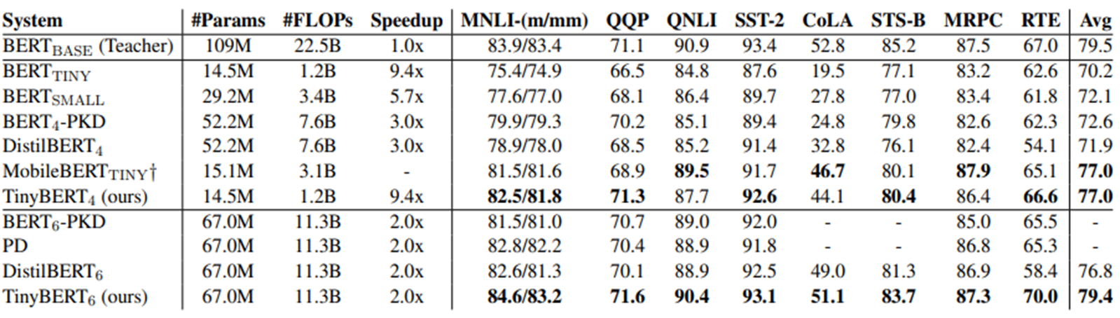 해당 연구에서는 transformer 기반 모델의 새로운 Knowledge Distillation 기법을 제안하여, $BERT_{base}$의 성능에 많이 뒤쳐지지 않는 가벼운 언어 모델을 개발했다. 이 연구에서 제안한 방법의 결과는 아래와 같다.